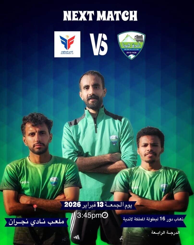 #المباراةالقادمة #حبونا 🆚 نادي المطوع 🗓️13 -فبراير – 2026 🕝3:45PM 🏟️ملعب نادي نجران كل التوفيق لأبطالنا… #بطولةالمملكة لأندية الدرجة4 #الدور_16 #ناديحبونا